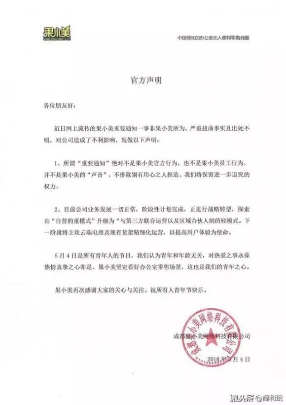 网上流传的果小美重要通知,虽然随后果小美方面发出官方回应,但是网上舆论以及接连爆出的无人货架“内幕”,都在将无人货架这个新零售形式推向悬崖。